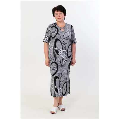 Платье женское полуприлегающего силуэта из трикотажного полотна, длинной ниже уровня колена. Вырез горловины О-образный, обработан планкой.