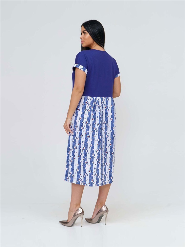 Артикул: НФ-00139515 Вид изделия: Платья Бренд: Текс-плюс Плотность материала: 145 г/м2 Материал: Кулирка Цвет: Голубой,белый,синий Состав материала: 100% Хлопок Для: Женщин Код товара: НФ-00139515 Платье женское трапециевидного силуэта с О-образной горловиной, кокетка на завышенной талии. Рукав цельнокроеный, короткий, манжета с пуговицей. На юбке складки на переде и спинке, накладные карманы с отворотами и пуговицей. Длина платья ниже колен. Комментарии к товару
