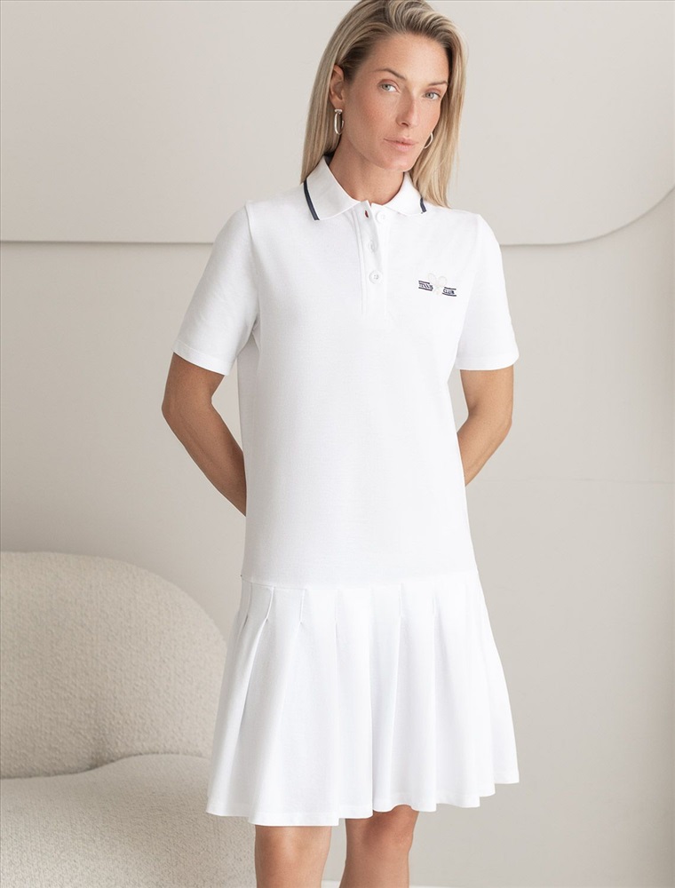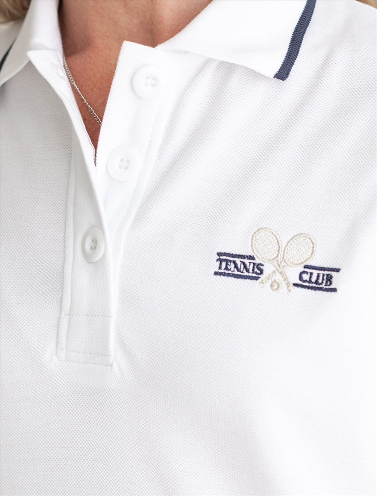 Платье-поло выполнено из фактурного трикотажа. Перевод принта: Теннисный клуб