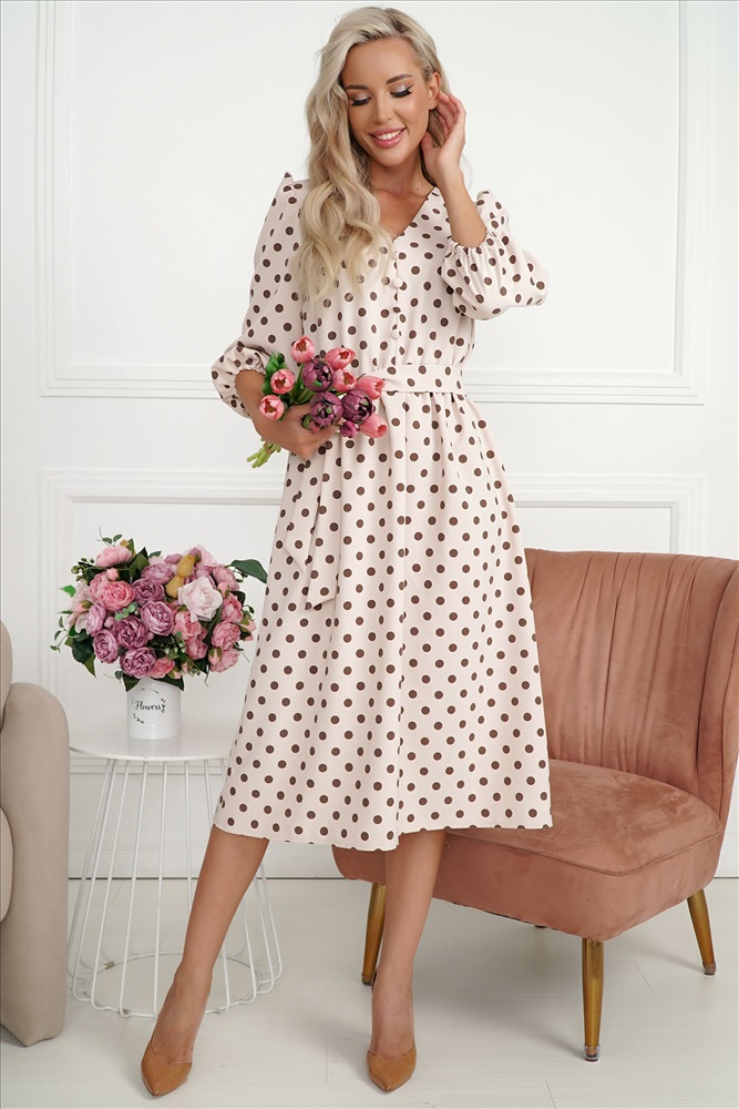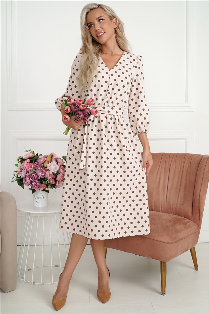 Это красивое платье в горох — отличный выбор для тех, кто ценит стиль и комфорт. Изготовлено из ткани, имитирующей лен, оно обладает легкой текстурой и приятным на ощупь материалом, что делает его идеальным для теплых дней. Пояс из основной ткани входит в комплект. Декоративные пуговицы по переду добавляют платью изысканности и оригинальности, подчеркивая его уникальный дизайн. Резинка по талии обеспечивает идеальную посадку, акцентируя фигуру и создавая элегантный силуэт.