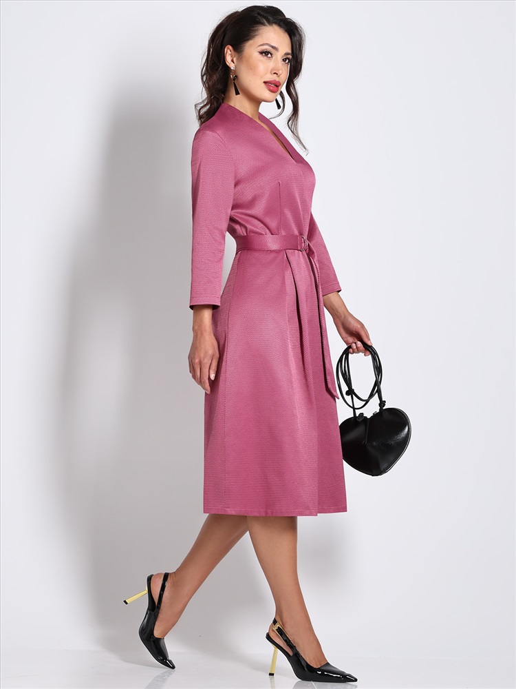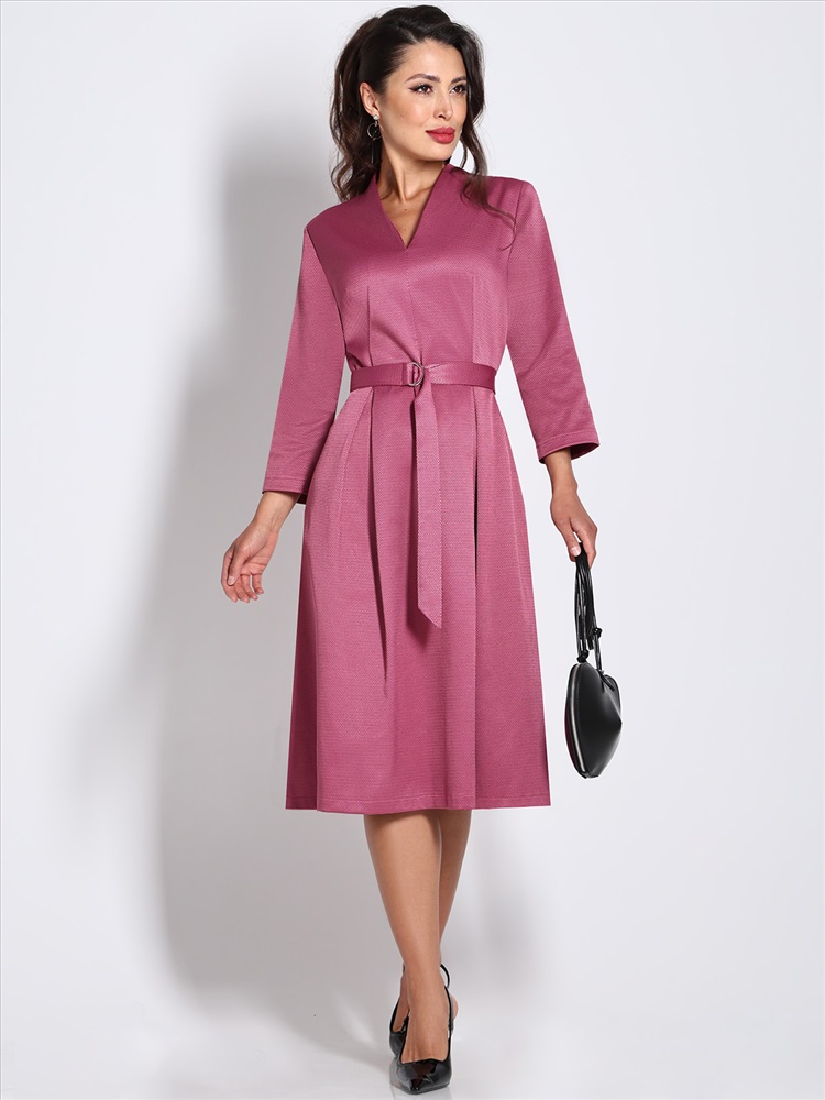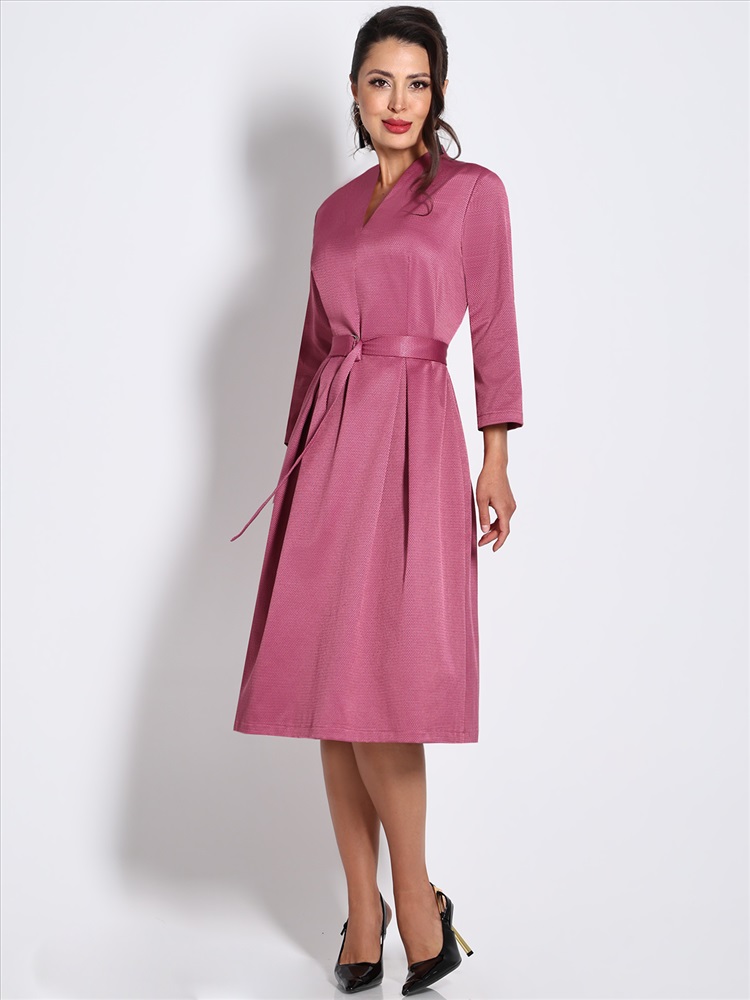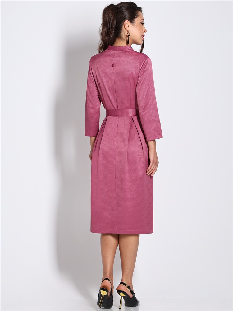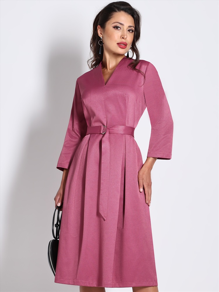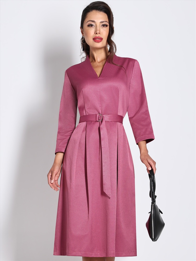 Нарядное платье — стильный вариант, который поможет создать женственный образ с ноткой романтики. Модель полуприлегающего фасона подчеркивает женственные изгибы тела, а расклешенная юбка с защипами маскирует недостатки в области бедер. Воротник-стойка, переходящий в V-образный вырез, и рукава длиной ¾ добавляют образу легкости, элегантности и утонченности. Пояс из комплекта смотрится лаконично и создает дополнительный акцент на талии. Модель выполнена из плотного материала, который слегка тянется и хорошо держит форму. Благодаря приятной расцветке, удачному фасону и качественной ткани платье украсит женщину любой комплекции и соберет множество комплиментов. Чтобы изделие не деформировалось, рекомендуется стирать его в деликатном режиме при температуре до 30 градусов, не отжимать и не выкручивать.