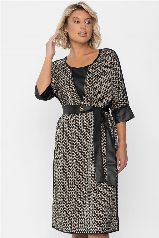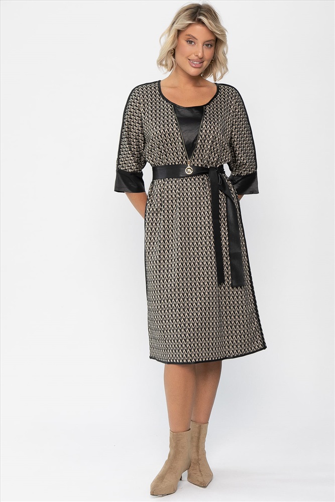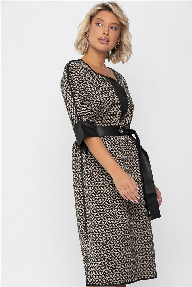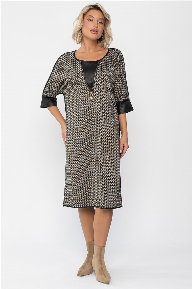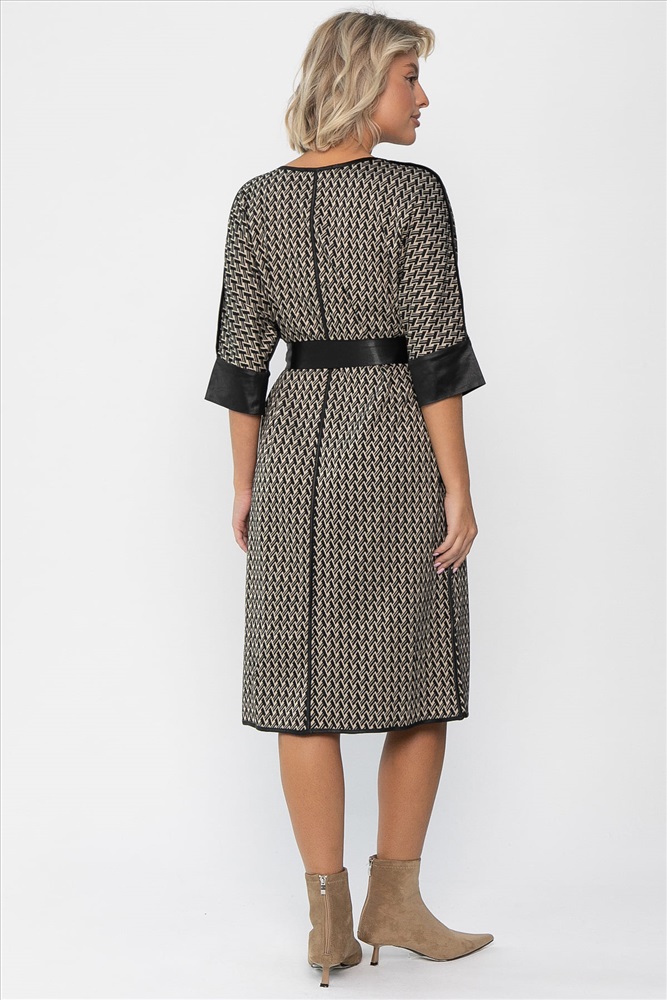 Стильное трикотажное платье полуприлегающего силуэта — это удобная и универсальная вещь. Оно подходит для повседневной носки и встреч с подругами. Округлый вырез с V-образным элементом придаёт образу особую изюминку.