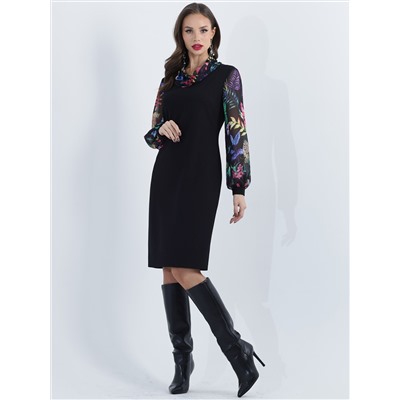 Классический полуприлегающий силуэт с минимумом швов — всегда выигрышная тема. Но в этот раз футляр декорирован шифоновым воротником-хомутом и шифоновыми же рукавами, что придает образу нарядность.