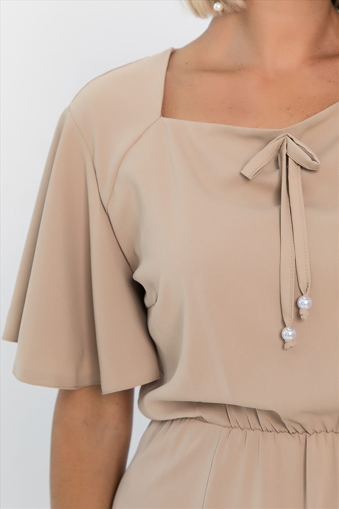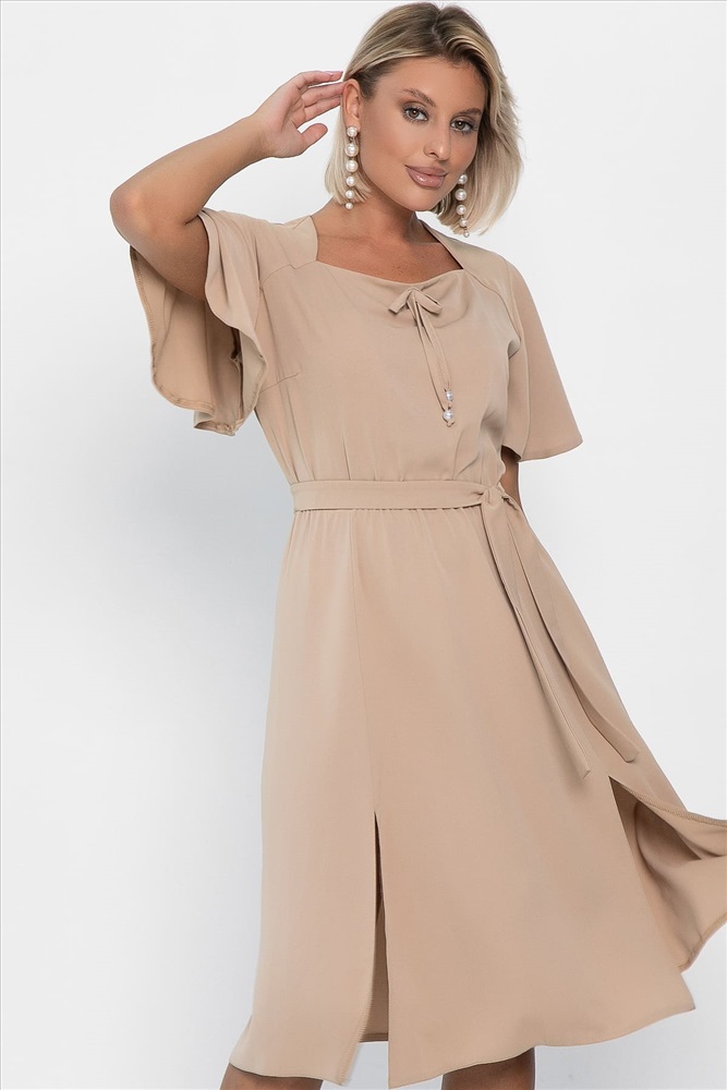 Платье из струящейся ткани приталенного силуэта. Кареобразный вырез изящно подчеркивает линию декольте. Юбка клешенная с двумя разрезами спереди. В таком платье вы точно будете в центре внимания. Оно достаточно сдержанно, но в то же время наполнено акцентными деталями, что идеально подчеркнет вашу красоту. Изделие имеет декоративный бантик с жемчугом. По талии на резинке. В комплекте пояс из основной ткани.