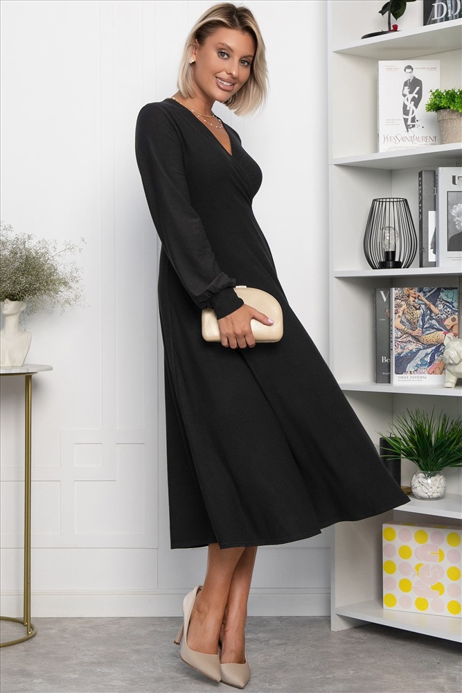 Элегантное черное платье сочетает в себе изысканность и удобство. Ткань невероятно приятна к телу и дарит комфорт. Оно имеет отрезной крой под грудью, а лиф с запахом создает утонченный и женственный силуэт, выгодно подчеркивая фигуру. Юбка полусолнца придает образу легкость и свободу движений. Это платье станет отличным выбором для любого случая: будь то романтическое свидание, деловой обед или вечер с друзьями.