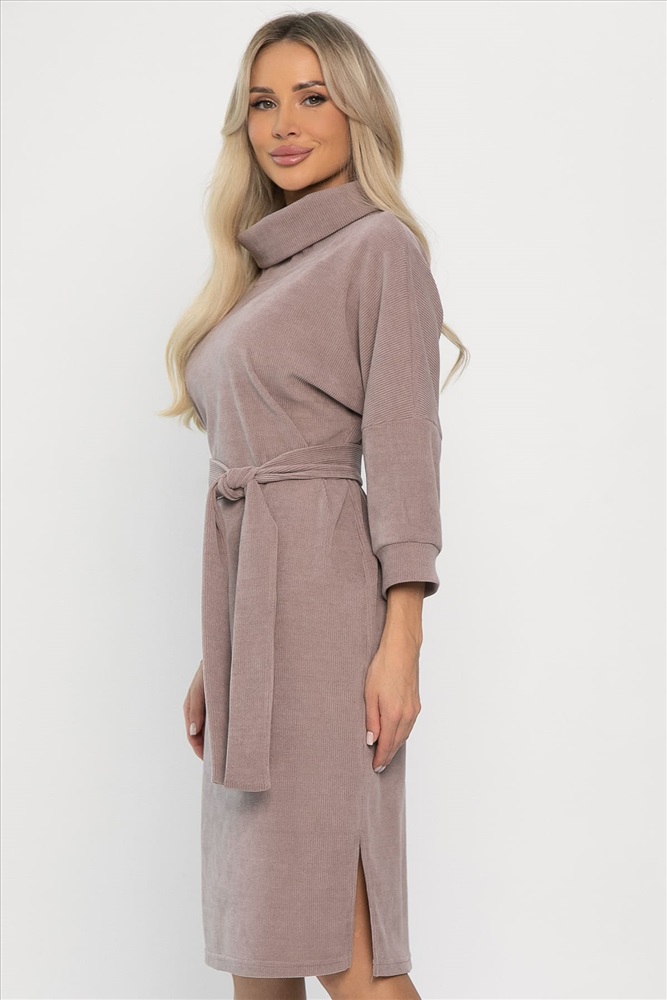 Женственное платье из трикотажа - вариант, который прекрасно подойдёт для создания стильного повседневного образа. Платье свободного кроя является самой удобной моделью платья, потому как скрывает недостатки и не ограничивает движений. Рукав три четверти, со спущенным плечевым швом, по низу манжет. В комплект входит пояс из основной ткани. По боковым швам изделия небольшие разрезы.