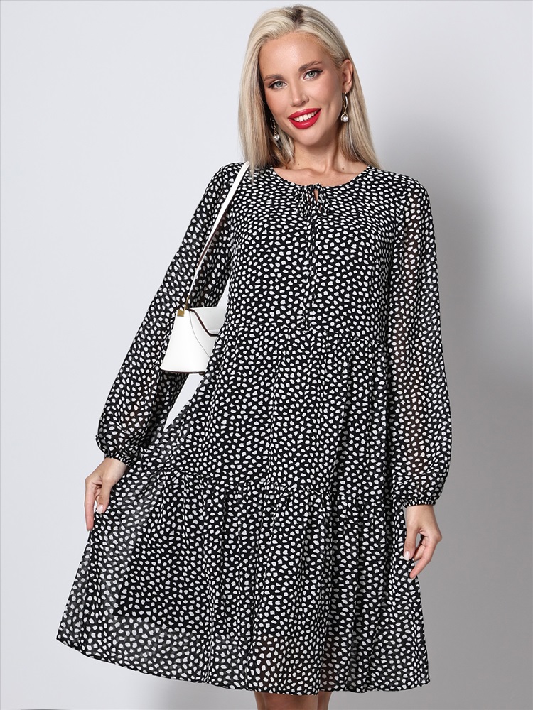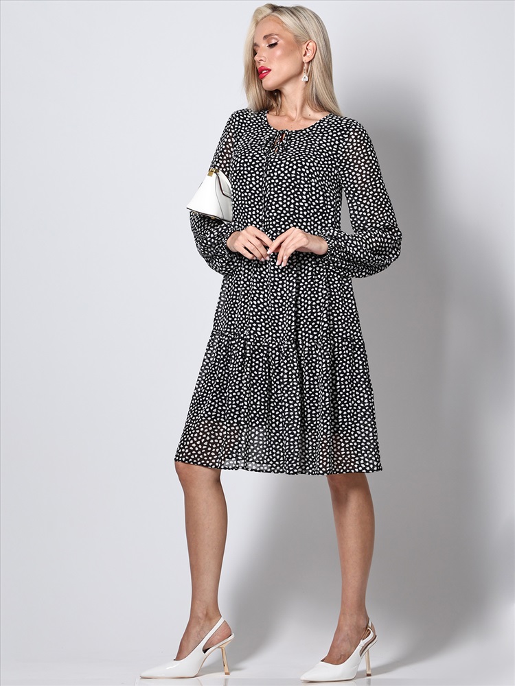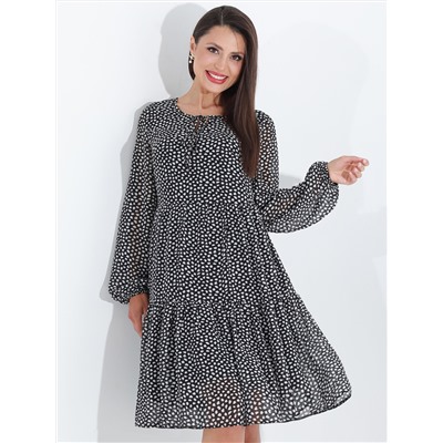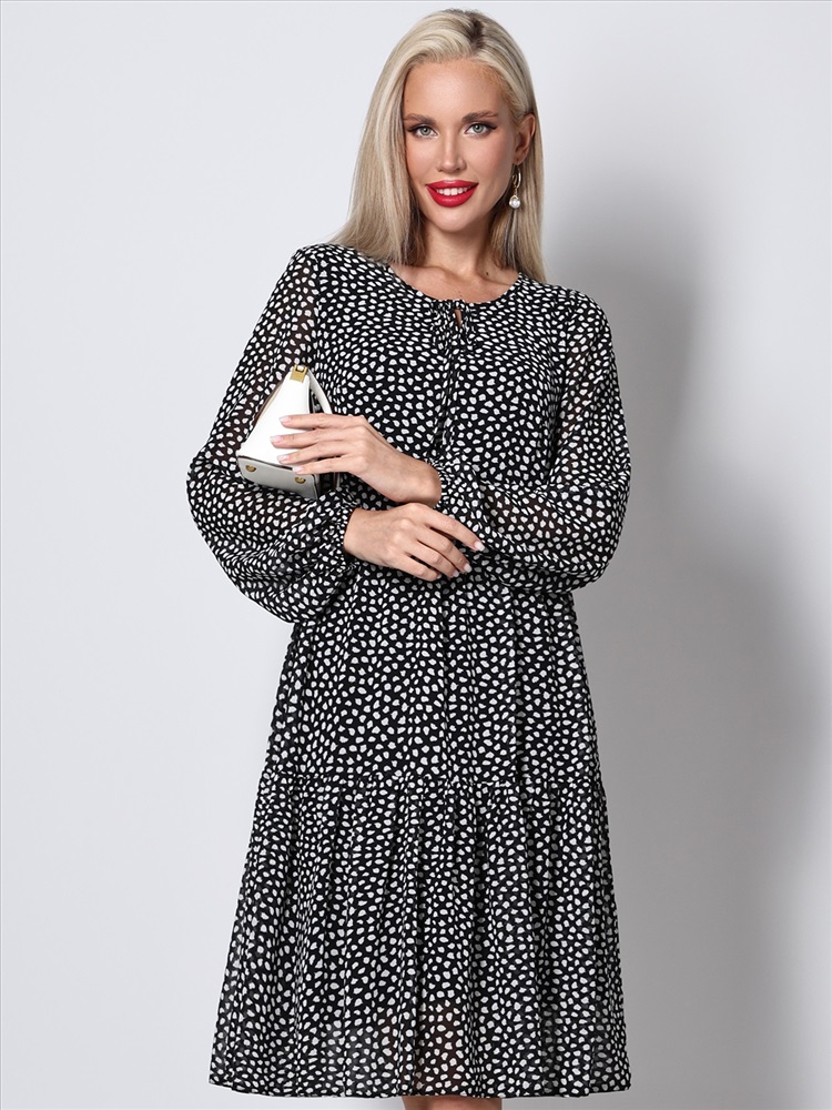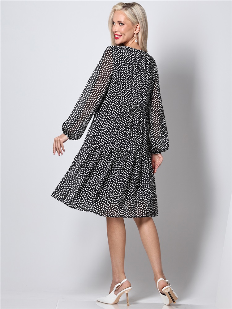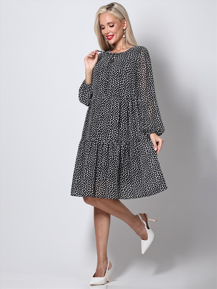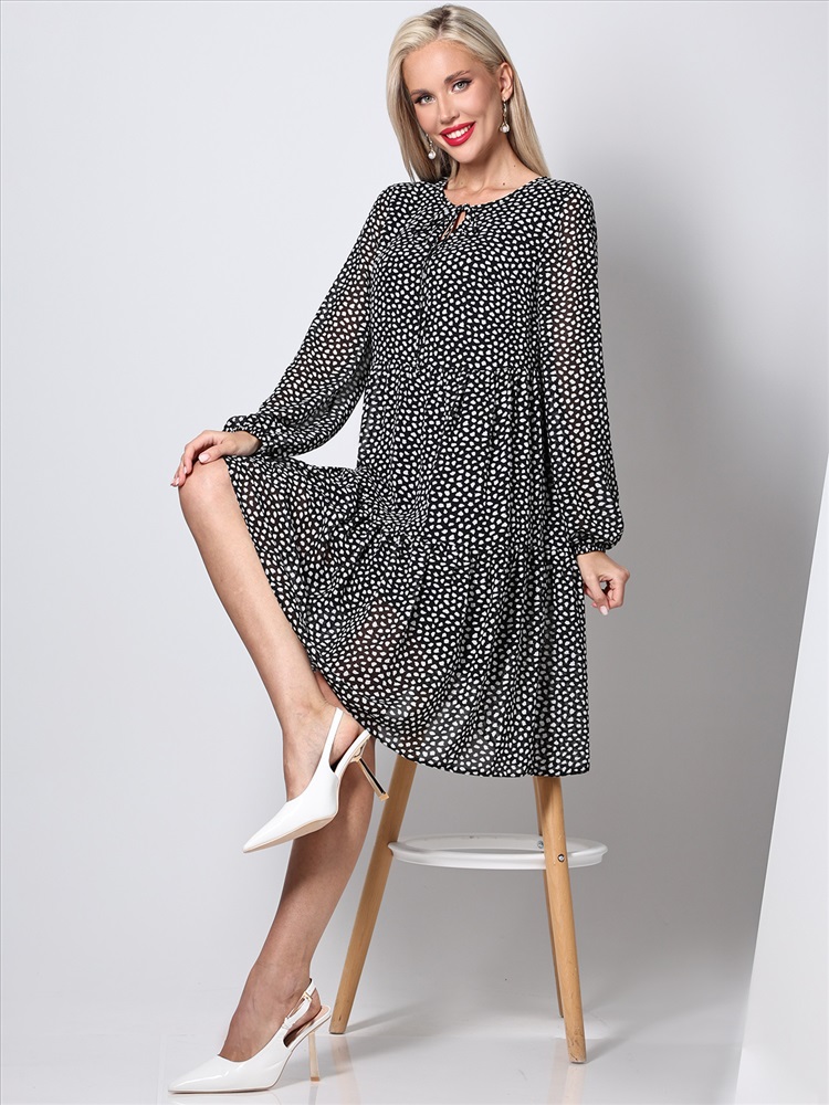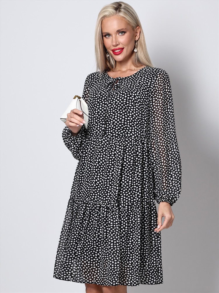 Декоративные элементы: Оборка Вид застёжки: Завязки Вырез горловины: Округлый Длина изделия по спинке: 97 Модель платья: А-силуэт Назначение: Повседневная Тип рукава: Длинный Уход за вещами: Бережная стирка при 30 градусах Фактура материала: Текстильный Состав: 100% полиэстер Тип ткани: плательная Цвет: Чёрный Воздушное шифоновое платье — нарядная модель в романтическом стиле, которая украсит как повседневный, так и вечерний гардероб. Свободный силуэт с ярусными оборками плавно расклешается к низу, дарит чувство легкости и прекрасно смотрится на женщинах любой комплекции. Пышные рукава выглядят кокетливо и нежно, а благодаря резинке по низу их длину можно регулировать. Завязки у округлой горловины с небольшим вырезом становятся утонченным завершением модели. Платье выполнено из невесомого приятного к телу шифона, который красиво струится в движении и создает эффект летящей походки. Модель на подкладе не просвечивает и позволяет чувствовать себя уверенно. Чтобы изделие долго радовало вас красотой и качеством, рекомендуется стирать его без отжима в деликатном режиме при температуре до 30 градусов. Длина:44 размер - 97 см46 размер - 97 см48 размер - 98 см50 размер - 98 см52 размер - 99 см54 размер - 99 см56 размер - 100 см Бережная стирка при 30 градусах Цвет изделия на фотографии может отличаться от фактического товара, что связано с искажением цветопередачи монитором, настройками фотоаппаратуры и прочими факторами Пропорции