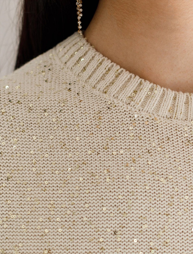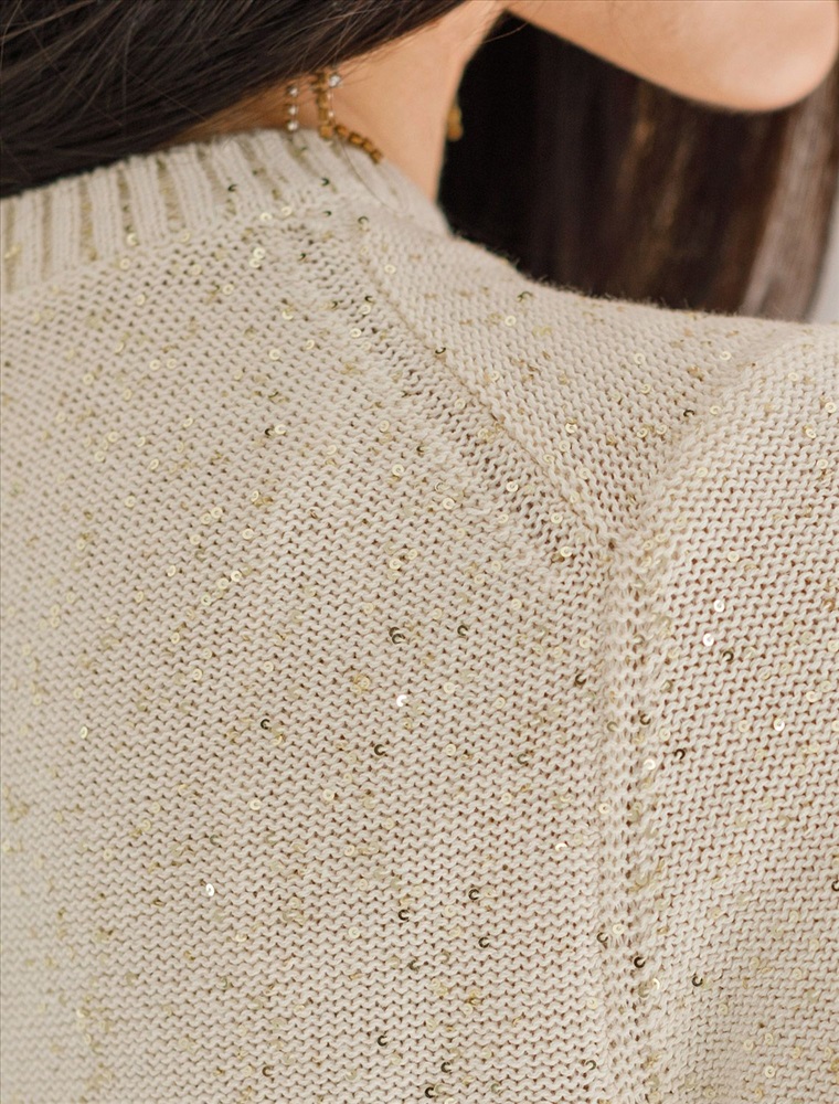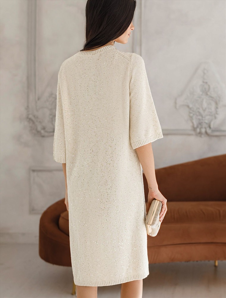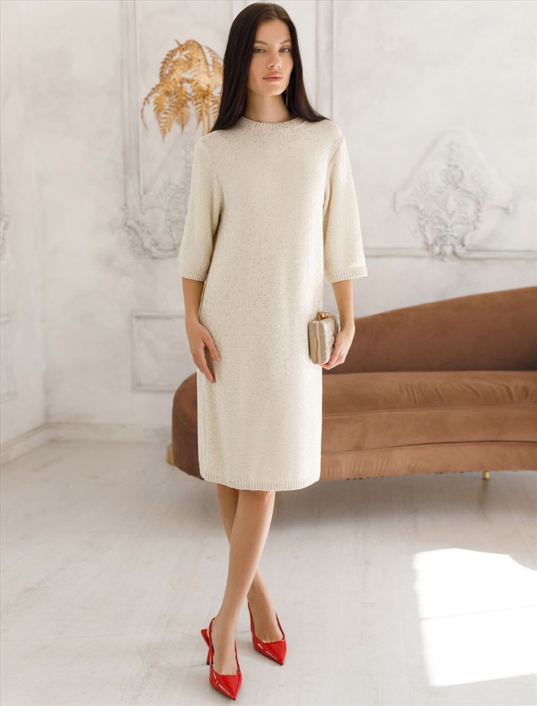 Плотность: 5 GG Эффектное платье бежевого цвета с широкими рукавами средней длины выполнено из хлопковой пряжи с вкраплением сияющих пайеток, что придает особую изысканность. Платье связано изнанкой, пряжа отличается легкостью и приятной текстурой, совершенно не колется, обеспечивает комфорт даже при длительном использовании, а натуральные волокна поддерживают оптимальный температурный баланс. Крой полуприлегающий, подчеркивает женственный силуэт, а круглый ворот, манжеты на рукавах и по низу гармонично завершают дизайн, создающий аккуратный образ. Благодаря универсальному крою, платье подойдет девушкам и женщинам пышных форм и больших размеров, длина миди подходит на низкий и высокий рост. Мерцающее полотно добавляет особого шарма вашему образу, делая его уместным как на праздник, так и для повседневного выхода. Новый год, вечеринка или любое другое мероприятие пройдут ярко — сияющие пайетки создают ощущение праздника в каждом движении. Это стильное платье поможет чувствовать себя уверенно на любом мероприятии в осенний и зимний сезон. Комментарии к товару