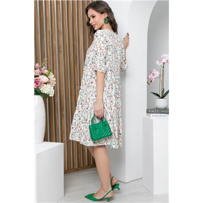 Артикул:П5666. Ткань:штапель. Состав:50% хлопок, 50% вискоза. Цвет:молочный. Принт:флористический. Вид застежки:без застежки. Силуэт:А-силуэт. Карманы:отсутствуют. Тип горловины:V-образный. Длина изделия по спинке:46-48/ 100 см, 50-52/ 101 см, 54-56/ 102 см. Длина рукава:46-50/ 37 см, 52-56/ 38 см. Рост модели:175 см. Само очарование: платье из лёгкой струящейся ткани с многоярусной юбкой - настоящий хит на все времена! Подобные силуэты хороши для платьев на каждый день. Рукав втачной, укороченный, по низу на резинке. Уход за изделием: бережная стирка до 30 градусов, нельзя отбеливать, деликатный отжим, гладить при t не более 110 С, гладить с изнанки. *Допуск отклонения длины при массовом производстве 1-3 см является нормой.
