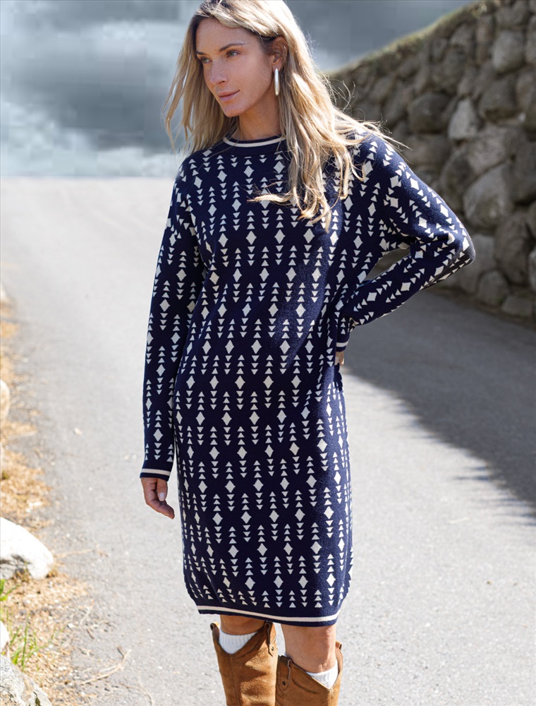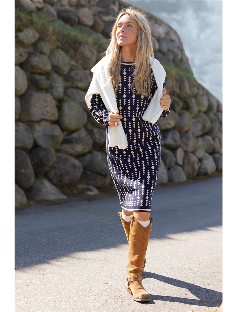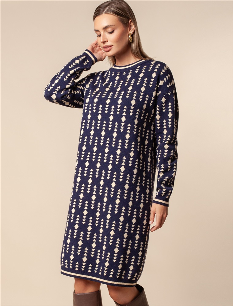 Платье жаккардовой вязки выполнено из мягкой пряжи на основе вискозы с добавлением кашемира. Модель свободного силуэта подходит для любой фигуры. Нежная пряжа очень комфортно ощущается на теле, сохраняя оптимальное тепло при этом не перегревая. Совет стилиста: жаккардовое платье отличная инвестиция в базовый гардероб, которая поможет создать дорогие образы. Носите с высокими сапогами удлиняя силуэт или плотными колготками.
