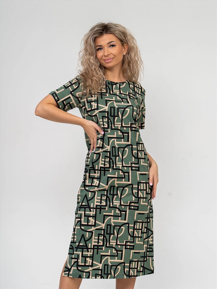 Состав: хлопок 100% Цвет: зеленый Платье молодёжное из набивного трикотажного полотна 100% хлопка длиной ниже колена. Рукав базового покроя, короткий. Вырез горловины О-образный. По боковым швам присутствуют разрезы.Платье идеально подойдёт для жаркого летнего дня. Комментарии к товару