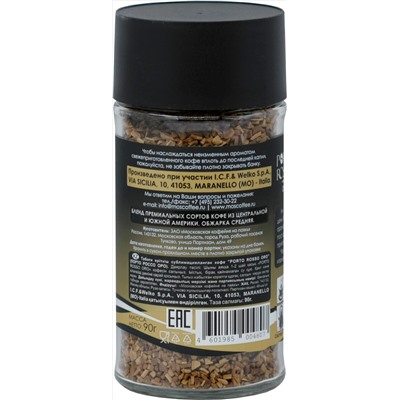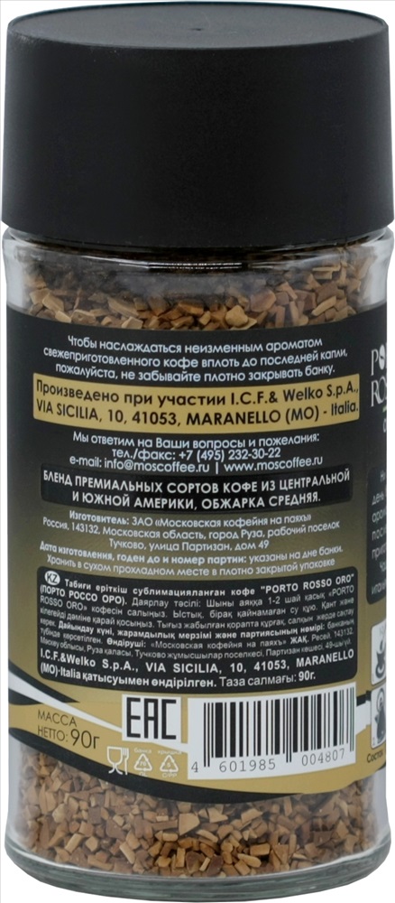 Натуральный растворимый сублимированный кофе. Состав: арабика.ORO — ароматный, с богатым вкусом и ярким послевкусием. Произведен из центральноамериканской и южноамериканской арабики при участии итальянской компании «ICF & WELKO S.P.A.». Обжарка средняя.Porto Rosso — вкус солнечной Италии!
