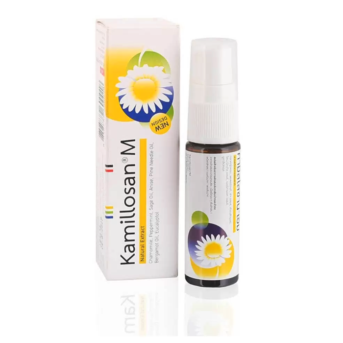 Высокоэффективный тайский спрей Камиллосан с ромашкой на основе сильнодействующего коктейля из натуральных масел с антибактериальным действием для быстрого снятия боли в горле, зубной боли и освежения полости рта. Спрей Kamillosan M обезболивает и дезинфицирует, способствует заживлению ранок на слизистой рта и поможет вылечить ангину буквально за 2 дня. В составе тайского аэрозоля от боли в горле содержатся 100% натуральные экстракты: органические масла ромашки, экстракт сосны, масло аниса, мята, масло бергамота и эвкалипта, экстракт шалфея. Показания к применению Камиллосан: