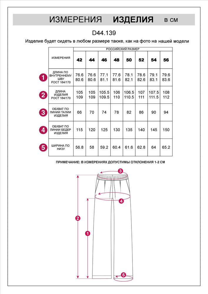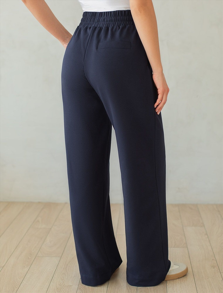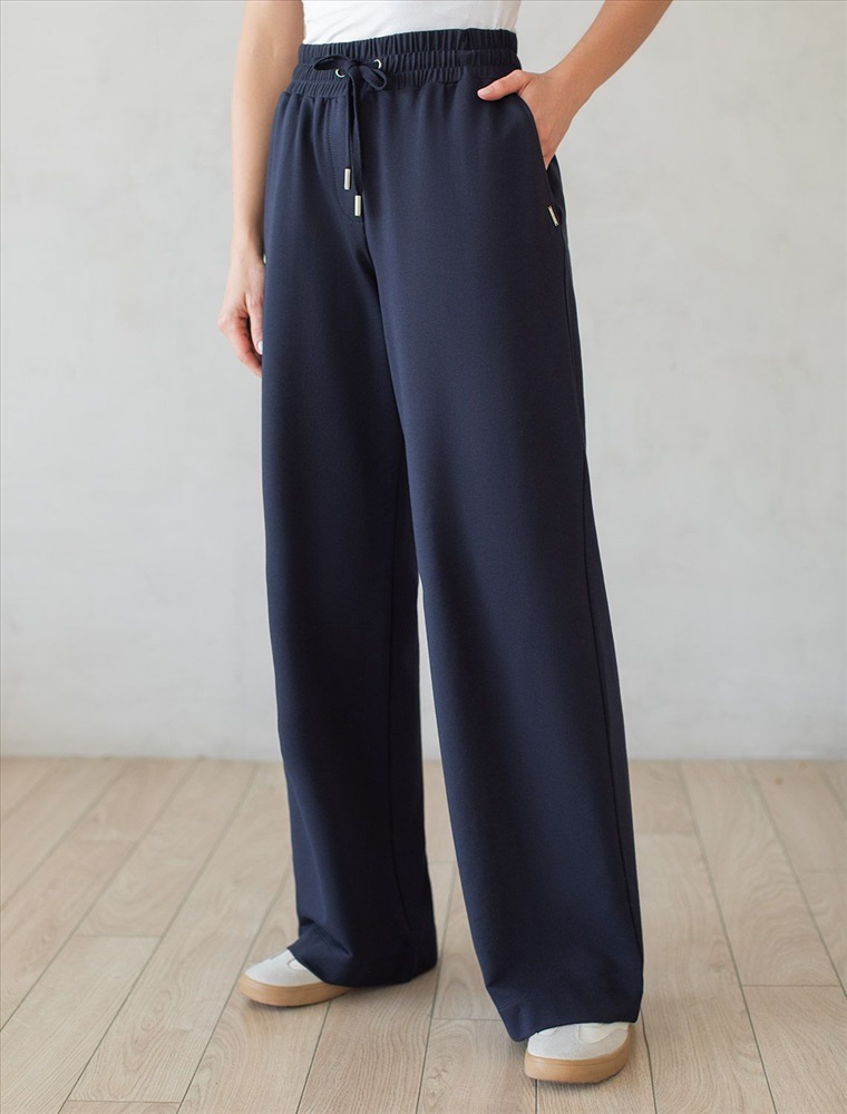 Брюки выполнены из футера двухнитки с эластаном. Модель прямого кроя дополнена боковыми карманами и одним задним карманом. Пояс выполнен из эластичного трикотажа в рубчик. В пояс вставлен плоский хлопковый шнур в тон изделия с золотистыми наконечниками. Изделие дополнено металлическим логотипом бренда. Сочетается в костюме с жакетом D49.078, джемпером D49.079, D49.080 и футболкой D49.081