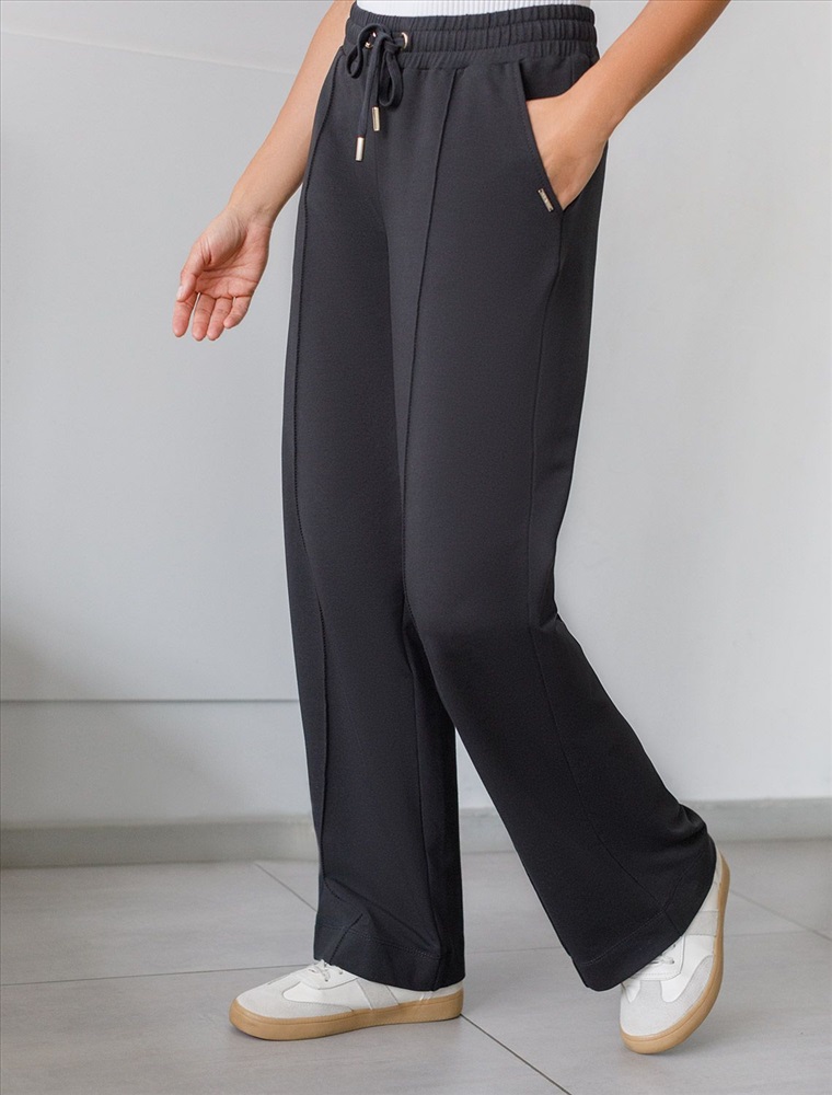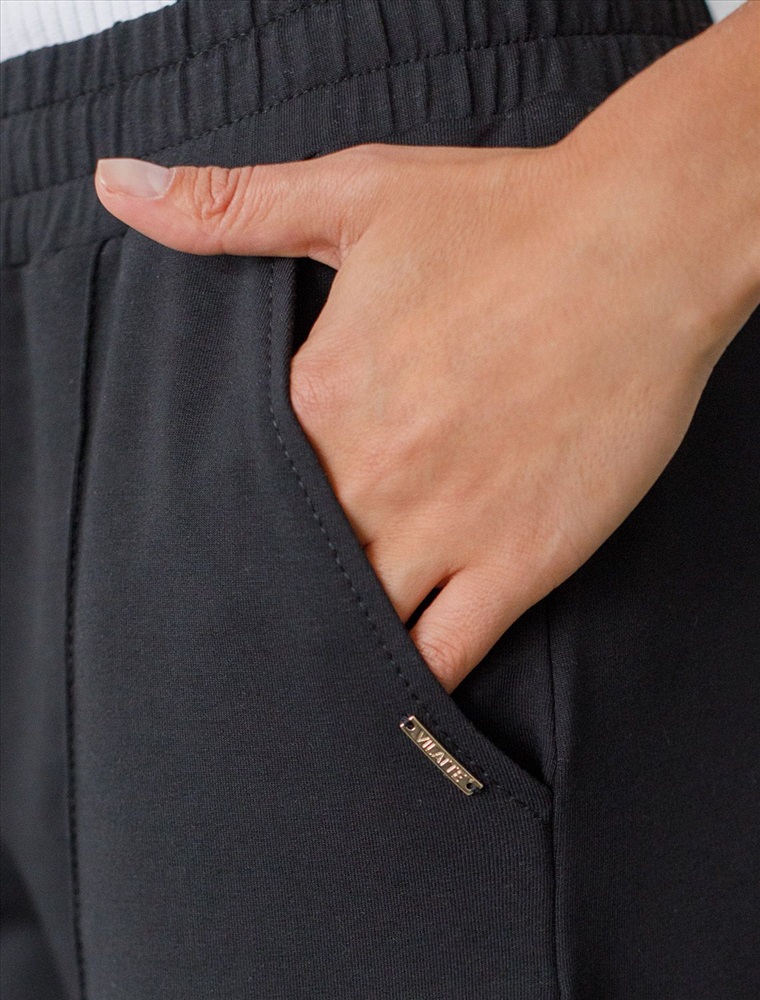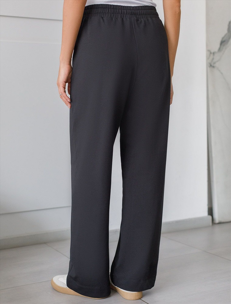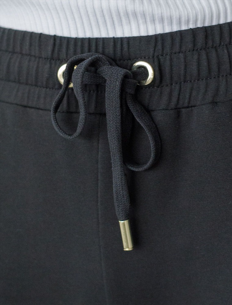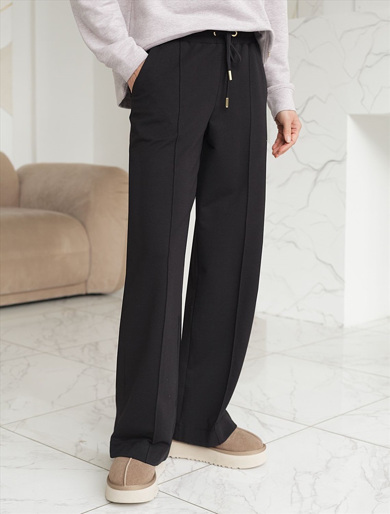 Брюки черного цвета прямого кроя выполнены из премиального футера-двухнитки. Лаконичный силуэт поддерживают застроченные стрелки, зрительно вытягивающие силуэт. Удобный пояс на резинке регулируется хлопковым шнурком с золотистой фурнитурой. Наличие эластана в составе изделия гарантирует комфорт и долговечность изделия. Эластичный материал хорошо пропускает воздух, позволяя телу дышать, и легко тянется, не ограничивая движения.
