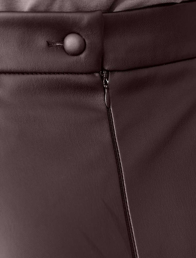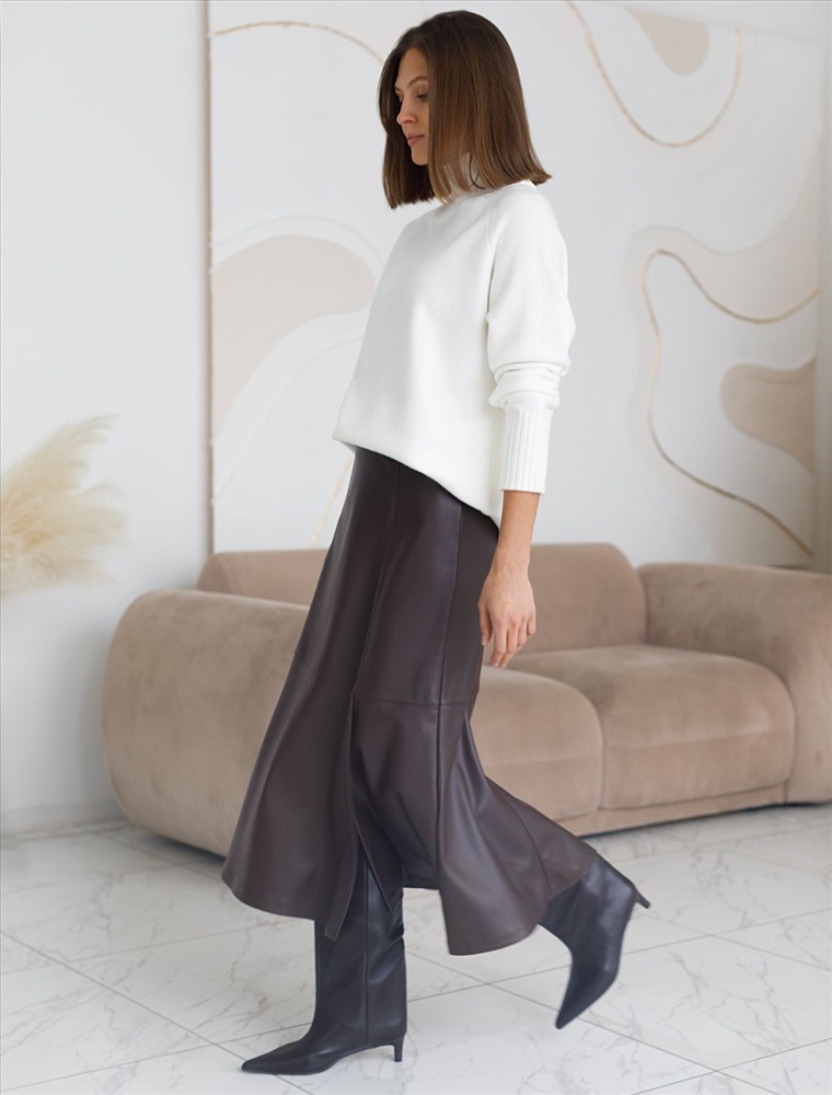 Размер товара на первом фото: 42 Стильное решение для смелых и уверенных образов. Юбка коричневого цвета, свободного кроя с плавные волнами на ткани, создает эффектный силуэт, подчеркивая женственность и динамику движения. Пояс стандартной ширины с обтачкой из мягкой изнанки обеспечивает комфорт при носке, не сковывая движений. Небольшой разрез до колена добавляет лёгкую дерзость и удобство при ходьбе. Качественная искусственная кожа придает юбке благородный блеск и износостойкость, сохраняя при этом легкость и эластичность.