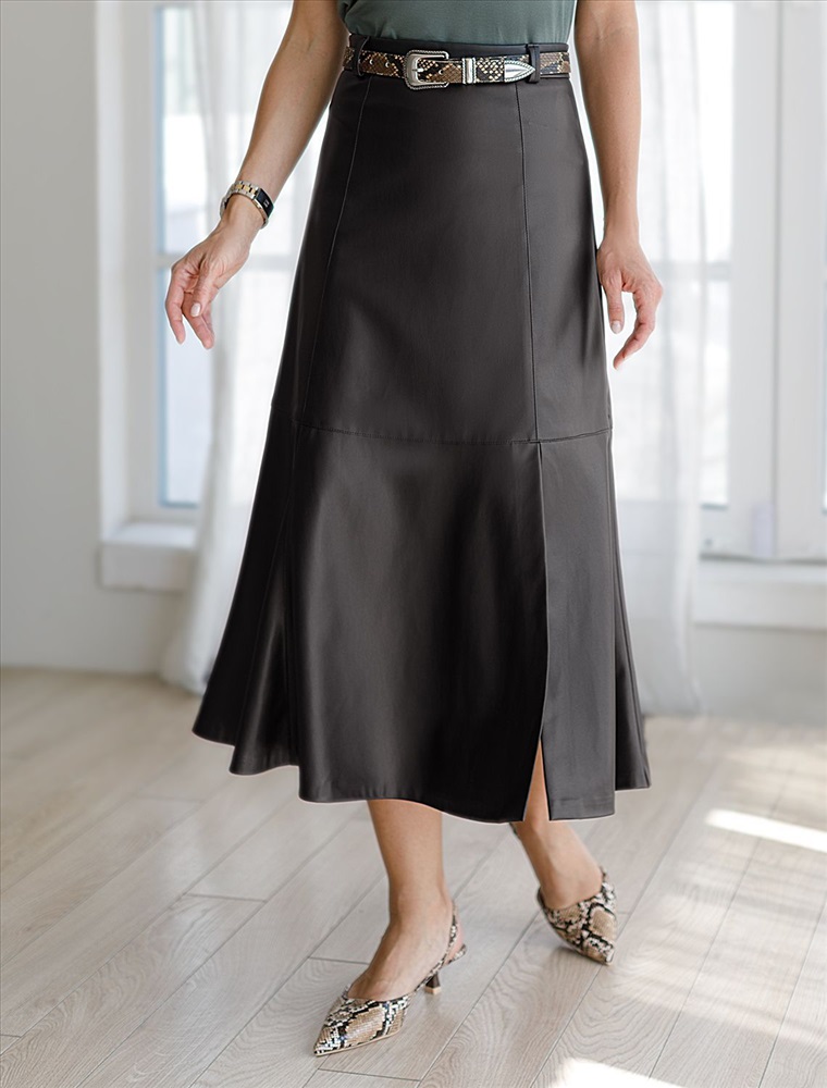 Размер товара на первом фото: 42 Стильное решение для смелых и уверенных образов. Юбка черного цвета, свободного кроя с плавные волнами на ткани, создает эффектный силуэт, подчеркивая женственность и динамику движения. Пояс стандартной ширины с обтачкой из мягкой изнанки обеспечивает комфорт при носке, не сковывая движений. Небольшой разрез до колена добавляет лёгкую дерзость и удобство при ходьбе. Качественная искусственная кожа придает юбке благородный блеск и износостойкость, сохраняя при этом легкость и эластичность.