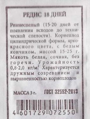Раннеспелый сорт, период от всходов до технической спелости 18-20 дней. Рекомендуется для выращивания в открытом и защищенном грунте. Урожайность высокая, 2,3-2,5 кг/м2. Корнеплоды цилиндрические, гладкие, выравненные, массой 18-25 г. Мякоть белая, плотная, сочная, хрустящая, слабоострого вкуса. Используется для потребления в свежем виде. Фасовка 3г Комментарии к товару