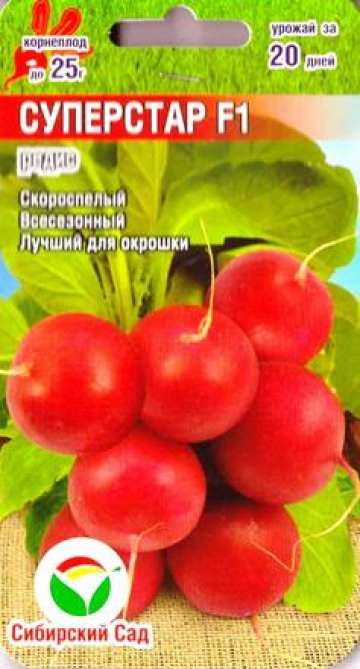 Скороспелый гибрид редиса голландской селекции для всесезонного выращивания в открытом и защищенном грунте. От всходов до технической спелости 19-21 день. Гибрид нейтрален к длине дня, устойчив к пониженной освещенности и цветушности, характеризуется дружным формированием урожая и выровненностью корнеплодов. Корнеплоды крупные (до 3 см в диаметре), округлой и округло-овальной формы, с гладкой кожицей ярко-красного цвета, средней массой 20-25 грамм. Мякоть белая, плотная, сочная, полуострого вкуса. Рекомендуется для использования в свежем виде. Урожайность2-2,5 кг/м2 .