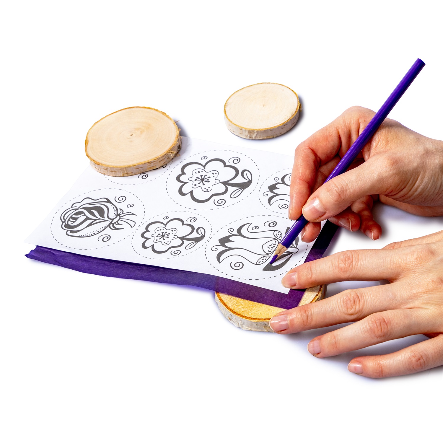 - деревянные спилы – 3шт. (диаметр до 9 см); - 3 бумажных шаблона с нанесенным рисунком; - копировальная бумага. Материалы: натуральная древесина, картон, бумага.