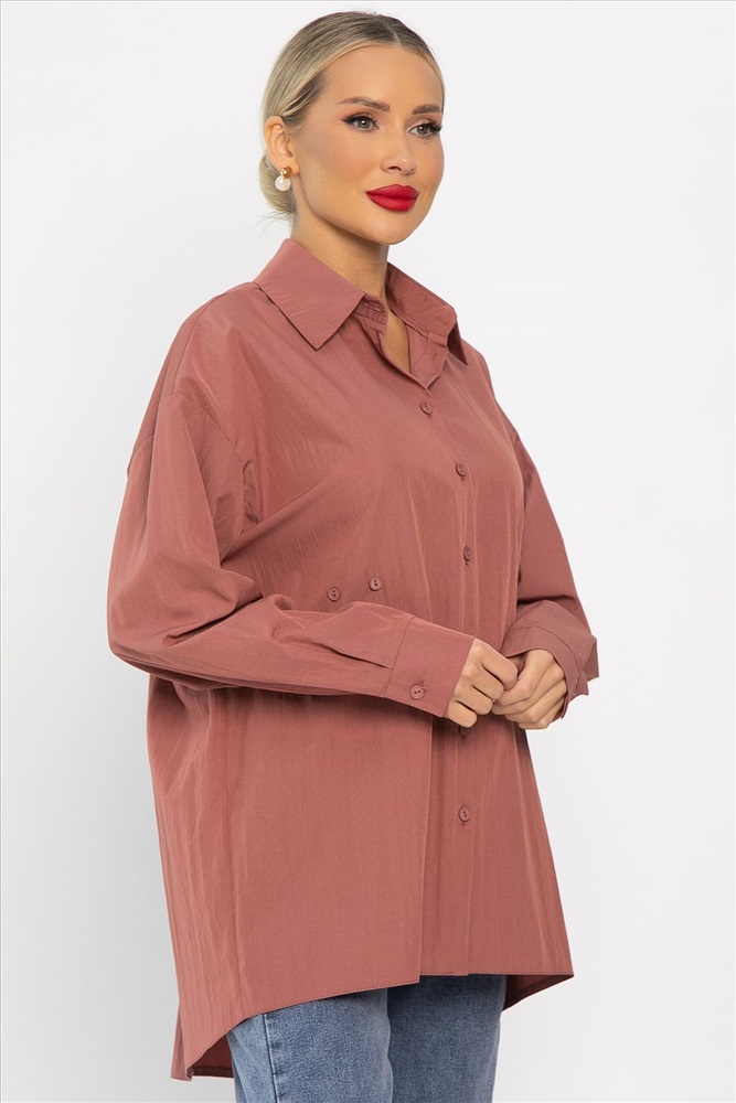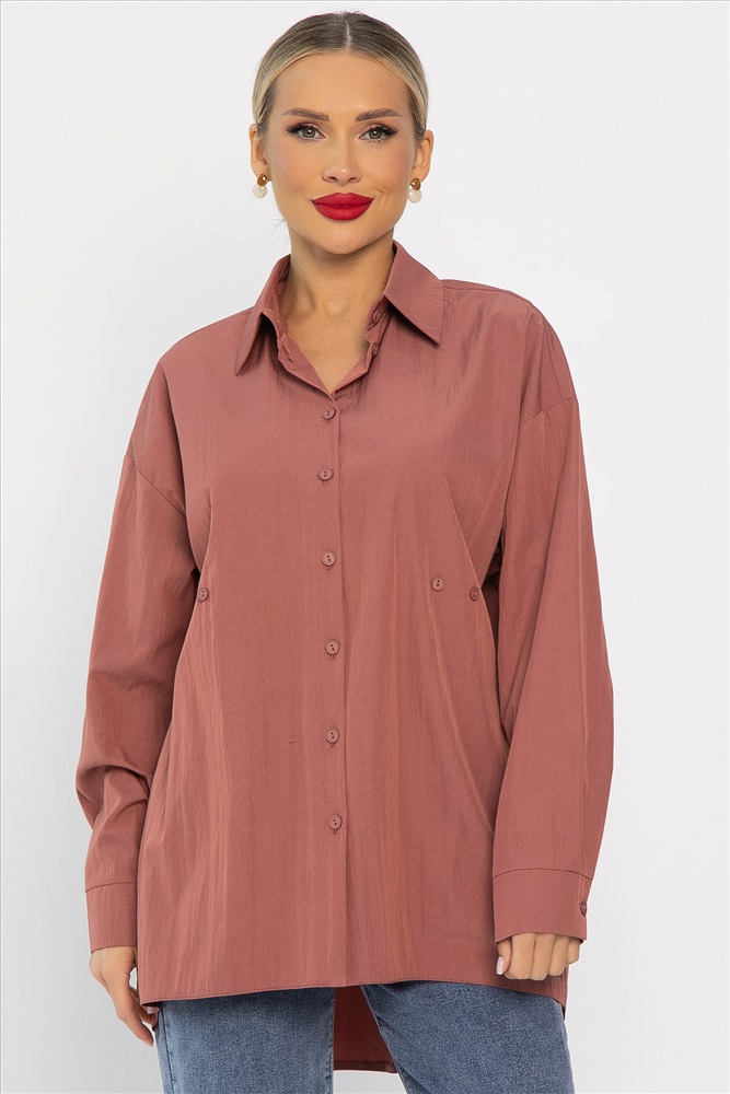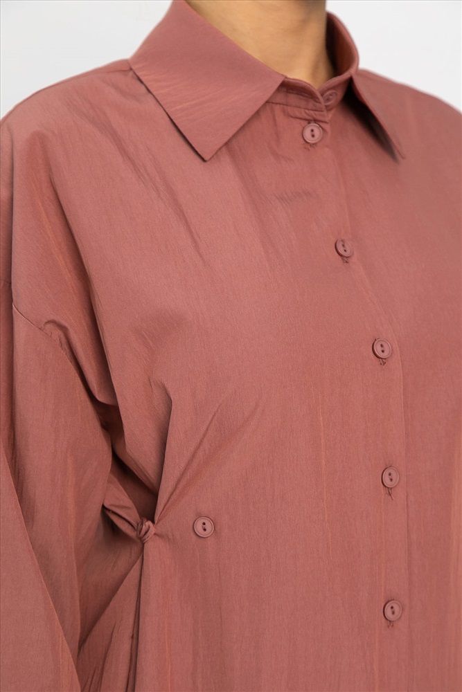 Рубашка свободного кроя в терракотовом цвете — это сочетание современного стиля и практичности. Воротник-стойка придаёт ей элегантность, а манжеты на рукавах обеспечивают удобство. Пуговицы в тон ткани создают аккуратный и гармоничный образ. Особенность этой модели — дополнительные пуговицы на талии спереди и боковые петельки, которые позволяют подчеркнуть силуэт. Их можно застёгивать по мере необходимости. Это идеальный выбор для тех, кто хочет выглядеть стильно и чувствовать себя комфортно в повседневной одежде. У данной расцветки ткань с эффектом жатки.