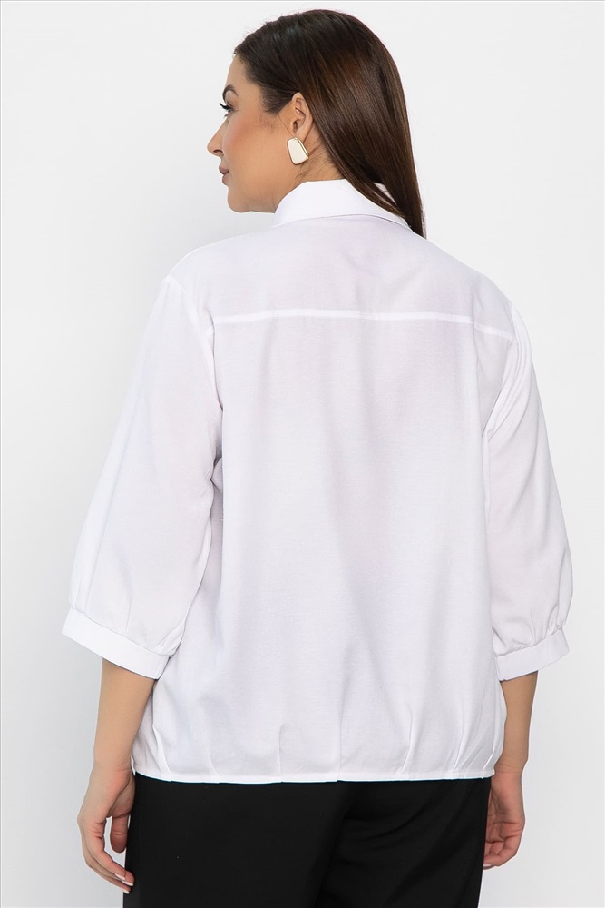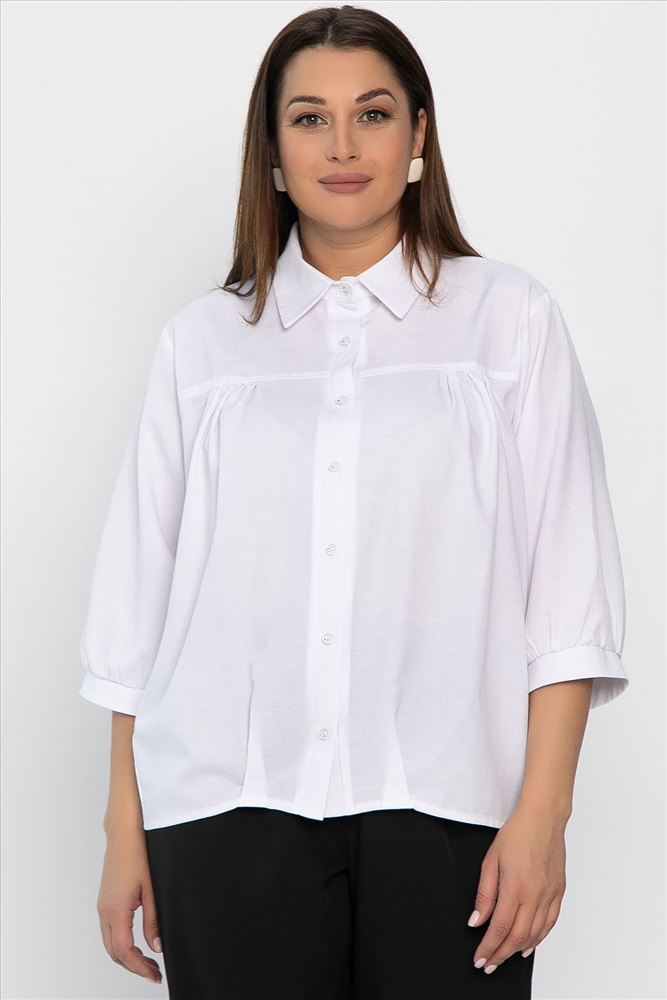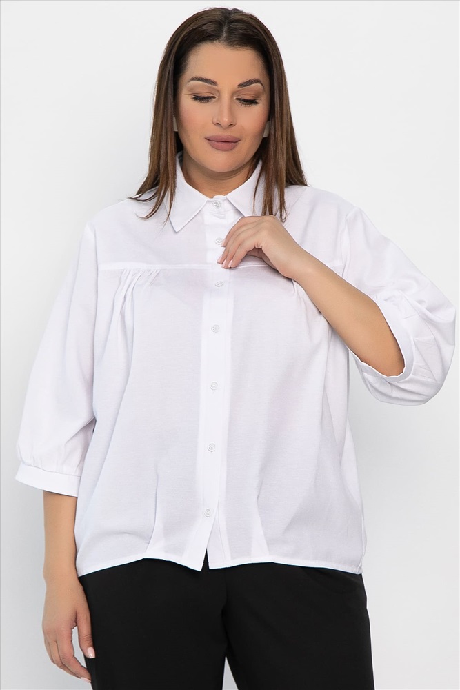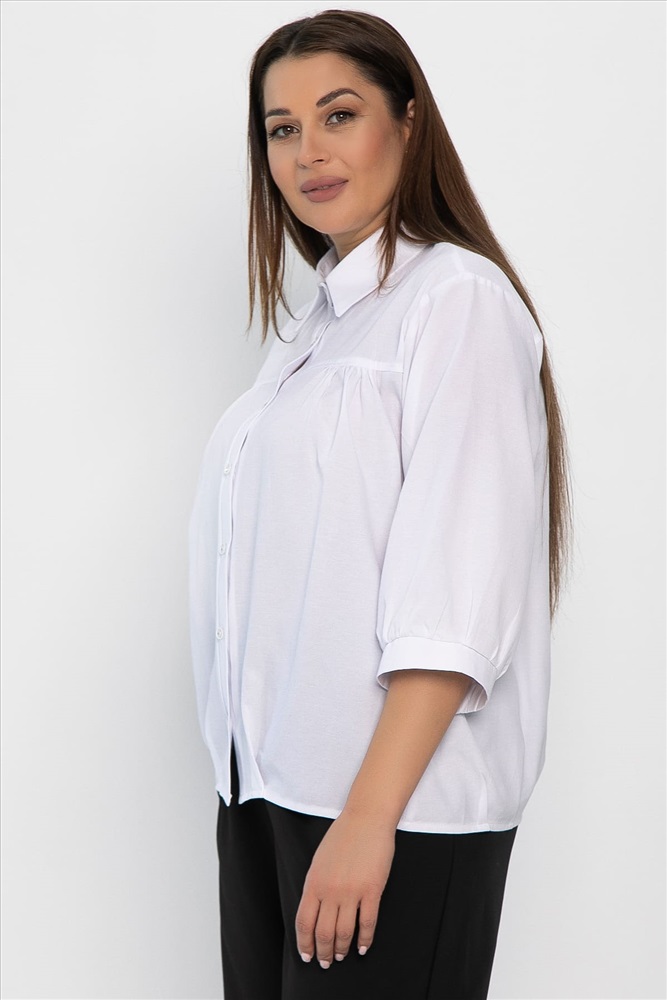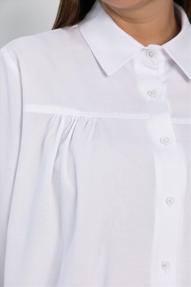 Представляем вашему вниманию женскую белую рубашку — незаменимый элемент любого гардероба. Вы можете использовать её как основу для повседневного образа или добавить немного строгости, надев поверх пиджак или жилет. Классический воротник плавно переходит в застёжку на пуговицы.