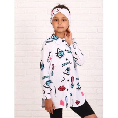 Состав: Хлопок 100% Материал: Кулирка Сезонность: Весна-лето Удлиненная детская рубашка для девочки из яркой, хлопковой ткани. Блузка прямого кроя, отложной воротник, планка и манжеты на пуговицах. В сочетании с велосипедками, джинсами, брюками можно создать незабывемый и стильный образ. Повязка не входит в комплект. Товар партнера Комментарии к товару