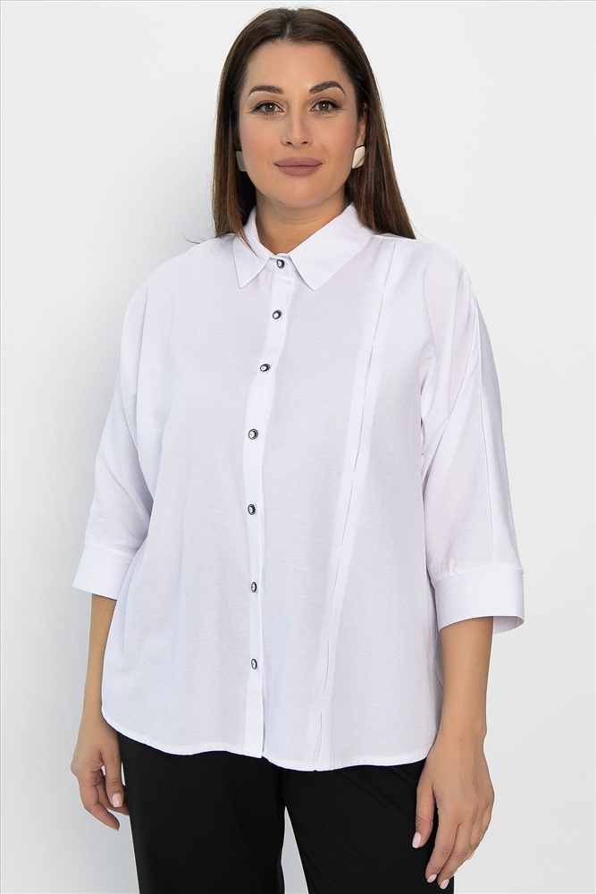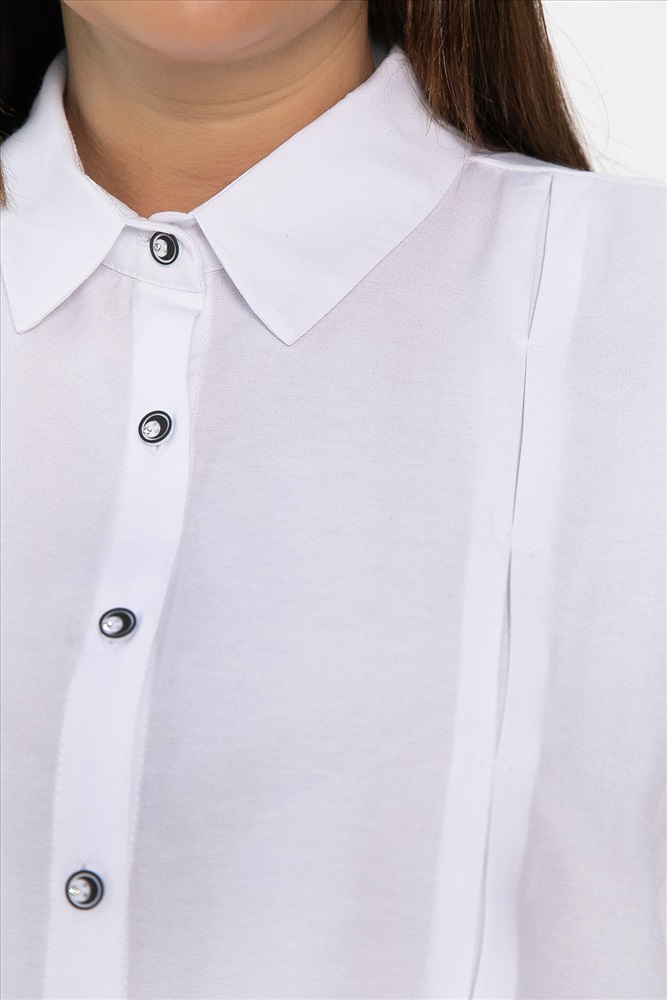 Белая женская рубашка — это универсальный и элегантный элемент гардероба, который прекрасно подходит как для создания строгого офисного или делового стиля, так и для повседневных образов. Воротник рубашечного типа, переходящий в застёжку на пуговицах. Рукава цельнокроеные, заканчиваются манжетами. По задней части кокетка со встречной складкой. По переду встречная складка. Низ изделия имеет округлую форму, а переднее полотнище короче заднего. Эта рубашка отлично сочетается с юбками, брюками и джинсами. Выбирая её, вы получаете множество возможностей для создания неповторимых образов.