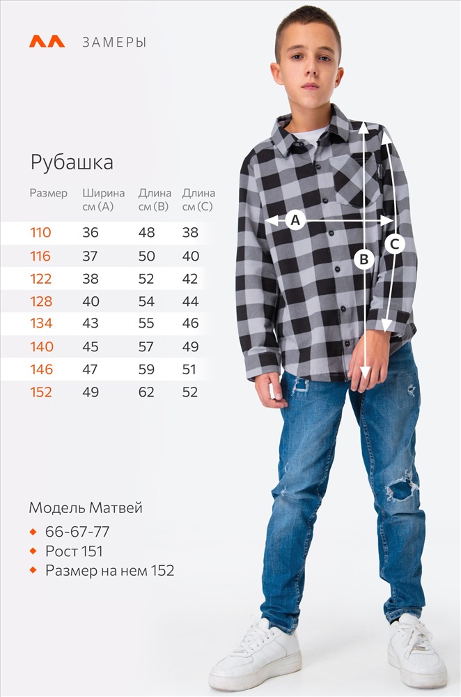 Модель Матвей, его рост 151, 66-67-77. На нем рубашка 152 размера.