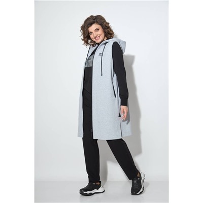 Комплект женский прямого силуэта. Жилет с разрезами по бокам универсальный. Джемпер выполнен из 2 видов ткани с декоративной печатью. Брюк слегка заужены к низу с карманами в боковых швах.