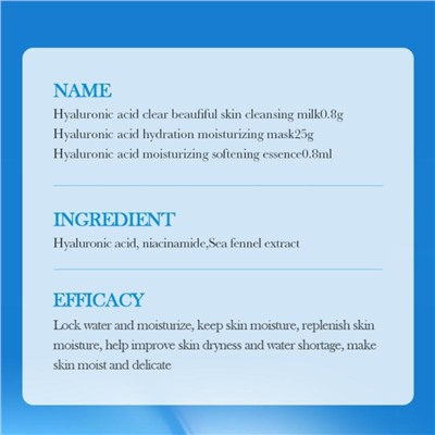 1 шаг – очищающее средство- мягко очищает от макияжа и загрязнений, увлажняет, смягчает и осветляет кожу. После использования средства лицо становится свежим и гладким. Способ применения: нанесите средство на ладони, вспеньте средство и нанесите на кожу лица. Помассируйте, смойте теплой водой. 2 шаг – тканевая маска глубоко насыщает питательными веществами и витаминами, смягчает, увлажняет, регулирует водно-липидный баланс, повышает упругость и эластичность кожи. Способ применения: нанести на кожу, плотно прижать. Оставить на 15-20 мин. 3 шаг – увлажняющая эссенция. Имеет мягкую текстуру. Эссенция прекрасно восполняет дефицит влаги в коже, смягчает и увлажняет. Способ применения: нанести средство на кожу, аккуратно вбить кончиками пальцев, дать впитаться Комментарии к товару