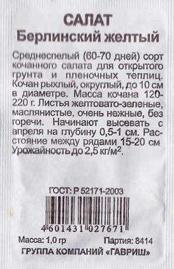 Среднеспелый (60-70 дней от всходов до образования кочана) сорт кочанного типа. Высота кочана около 10 см. Широкие листья светло-зелёной окраски имеют приятный желтоватый оттенок и нежный маслянистый сладкий вкус без горечи. Кочан массой 100-200 г, округлый, рыхлый. Вкус отличный. Сорт отличается ярким внешним видом, прекрасными вкусовыми качествами, высоким содержанием витаминов и микроэлементов. Рекомендуется для выращивания в открытом грунте. Посев семян непосредственно в грунт в апреле - мае. На рассаду высевают в марте - апреле, высадка рассады – в мае. Устойчив к цветушности. Схема посадки 30x30 см.