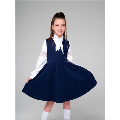 Описание и параметрыСтильный школьный сарафан из футера синего(индиго) цвета для девочки, отрезной по линии талии. Юбка расклешенная, со сборками, лиф с имитацией запаха. Изделие выполнено из трикотажа премиального качества - ПЕНЬЕ, с содержанием хлопка более 92%