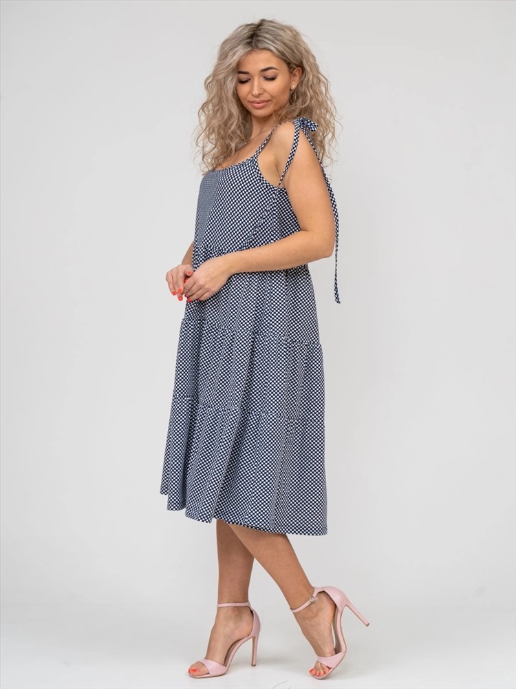Состав: хлопок 100% Цвет: синий / белый Сарафан молодёжный расклешенного силуэта, состоящий из 4-х ярусов со сборкой. Изготовлен из трикотажного полотна «кулирка» на регулируемых лямках. Изделие подойдет для повседневной носки и отдыха. Комментарии к товару