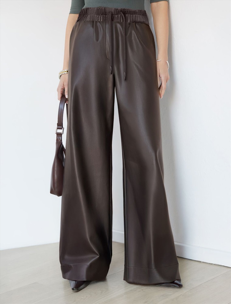 Трендовая модель для смелых fashion-образов. Эти брюки из качественной искусственной кожи создают бунтарский урбанистический лук. Модель с высокой посадкой на поясе и равномерно широким клешёным силуэтом от бедра до низа визуально вытягивает фигуру. Мягкая подкладка пояса обеспечивает комфорт, не сдавливая талию. Универсальный коричневый цвет легко комбинируется с объемными худи, кроп-топами или лаконичными рубашками. Идеальны для создания образов в стиле гранж, streetwear или modern rock-chic.