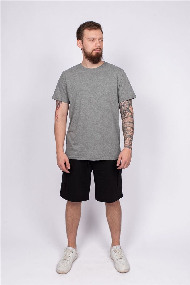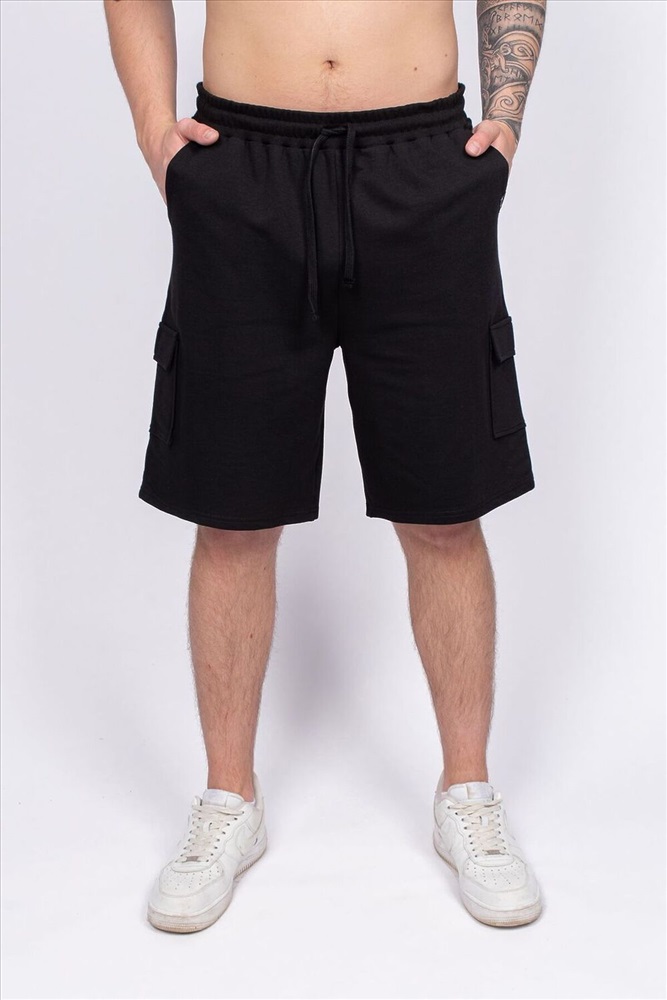 Шорты мужские, прямого силуэта с накладными карманами. Отрезной пояс, в цвет изделия, из кашкорсе с эластичной тесьмой внутри, закрепленной в шов. По поясу шорт вставлен плоский утягивающий шнурок. Длина шнурка = длина пояса + 45 см для возможности завязывания. На передней половинке шорт карманы с отрезным бочком. На боковом срезе шорт располагается накладной карман с клапаном из основного полотна. Карман располагается с 2-х сторон симметрично. Низ изделия обработан швом в подгибку. На левом кармане вшивной элемент, закрепленный отстрочкой. Модель рассчитана на рост 176-182см.