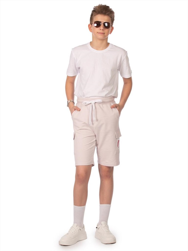 Длина до колена, пояс на резинке с завязками. На изделии присутствуют боковые карманы и накладные с принтом. Тип ткани: Футер 2-х нитка.