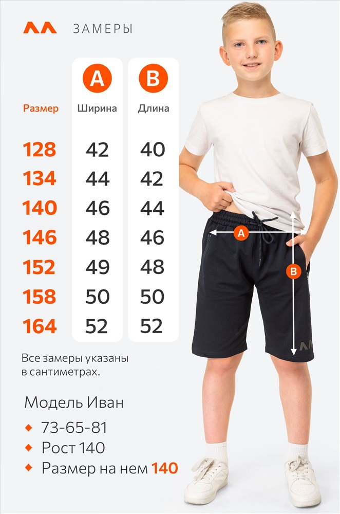 Модель Иван, рост 140 см, параметры 73-65-81 см. На нем 140 размер.