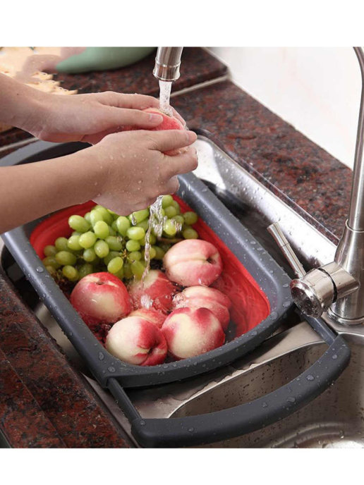 В арсенале любой хозяйки помимо ножей и посуды должны быть предметы, на которые возлагаются не менее ответственные функции - помыть овощи, фрукты, слить воду после варки и т.п. Сито-дуршлаг из силикона легко справляется с подобными задачами. Вам нужно быстро помыть фрукты? Положите их в удобный сито-душлаг, выдвиньте телескопические ручки и поставьте его на раковину под открытый кран с водой. Лишняя жидкость стечет в раковину самостоятельно, вам не нужно ее сливать из емкости. Так же хорошо справляется компактное сито с подобной задачей, если вам необходимо откинуть макароны или спагетти. Данный прибор облегчает работу хозяйки, его очень легко мыть. У силиконового дуршлага есть важный плюс. Ополосните дуршлаг-сито после использования на кухне, подождите несколько минут, пока он высохнет. А затем компактно сложите и уберите в кухонный шкаф.