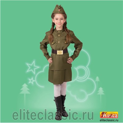 В костюм входит: пилотка, гимнастерка, ремень, юбка.