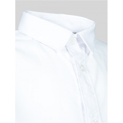 Цвет белый. Воротник классический рубашечный с уплотнением. На груди накладной карман. Застежка на пуговицах.