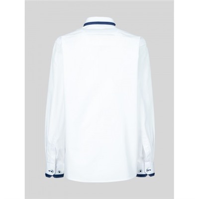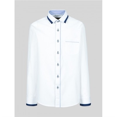 Цвет белый. Воротник классический рубашечный с уплотнением. Накладной карман на груди. Застежка на пуговицах.