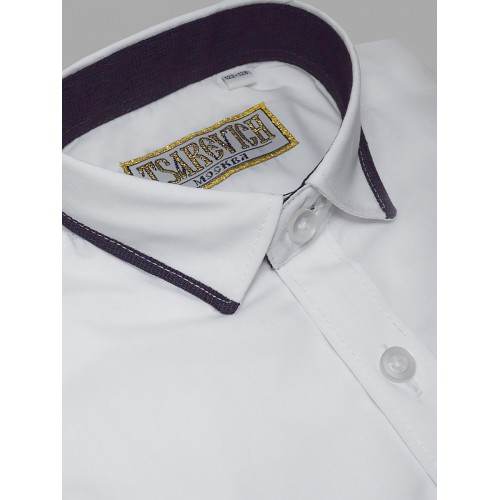 Белоснежная школьная рубашка для мальчика от российского бренда Tsarevich прекрасно подойдет как для повседневной носки в школу, так и для торжественных мероприятий.