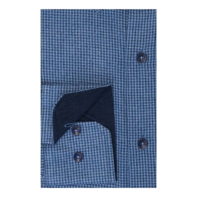 Модель прямого силуэта, комбинированная контрастной тканью по внутренним вороту и манжетам. Цвет темно-голубой (клетка). Длинный рукав. Товар соответствует техническому регламенту о безопасности продукции легкой промышленности.
