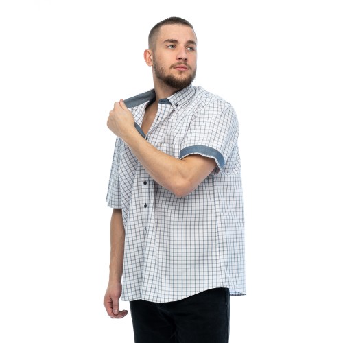 Модель прямого силуэта с накладным нагрудным карманом, с воротником "button-down" (на пуговицах). Цвет серый/розовый/белый (клетка). Короткий рукав. Товар соответствует техническому регламенту о безопасности продукции легкой промышленности.