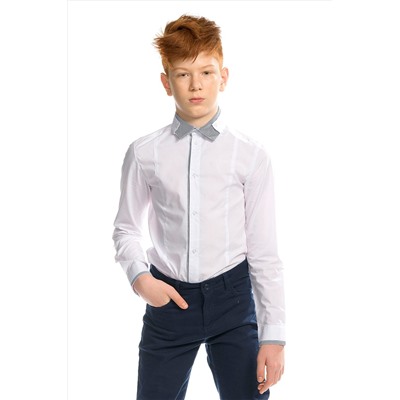 Рубашка для мальчиков с длинным рукавом. Сорочка прилегающего силуэта с вертикальными рельефами на переде и спинке. Двойной воротник с высокой стойкой. Верхний воротник из основной ткани крепится пуговицами к нижней части воротника из ткани в мелкую полоску контрастного цвета. Внутренняя часть стойки, нижняя часть планки (с пуговицами) и нижняя часть манжет также из ткани в полоску.