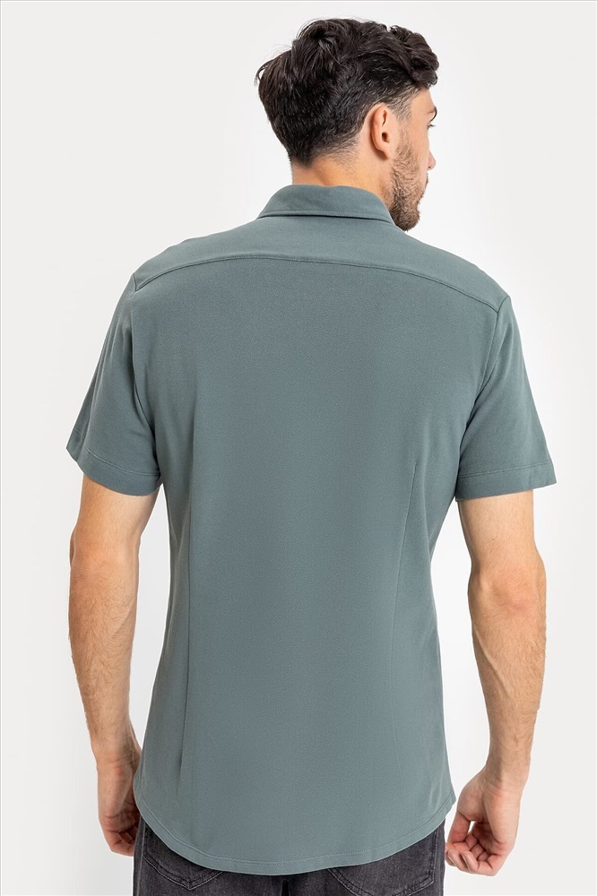 Сорочка верхняя мужская изготовлена из трикотажного полотна. Сорочка прямого силуэта, длиной до середины бедер. Плечевые швы смещены в сторону переда. Рукава втачные короткие , нижний срез рукава обработан швом вподгибку. Горловина округлой формы с рубашечным воротником, отложным на стойке. По переду обработана застежка на планке на петли и пуговицы. Спинка с отрезной горизонтальной кокеткой. Нижняя деталь спинки с вытачками. Нижний срез сорочки фигурный обработан швом вподгибку.