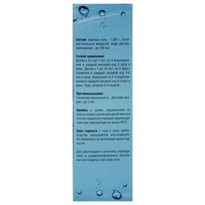 Состав: действующее вещество — морская соль (1,08 %); вспомогательное вещество — вода очищенная.