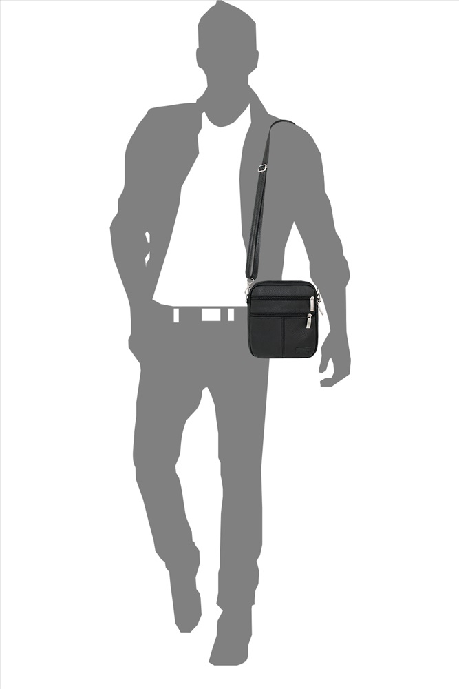 Сумка мужская небольшого размера со съемным регулируемым ремнем-стропой через плечо. Сумка застегивается на молнию и имеет одно отделение. На передней стенке расположены два кармана на молнии. Задняя стенка имеет один карман на молнии и пластиковую ручку на стропе. Сумка на подкладке. Внутри сумки есть накладной карман на молнии.
