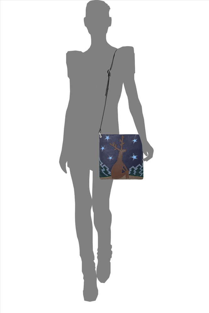 Артикул: 144-0101-120; Аппликация: "Олень в лесу"; Цвет: черный; Натуральная кожа: флотер; Подкладка: 100% п/э; Ремень плечевой: 108-130 см; Параметры: 26х27х3 см